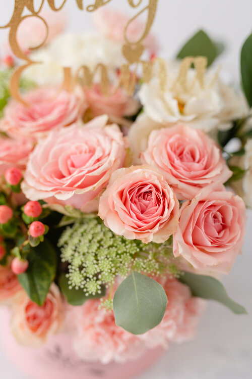 designer’s choice of our most beautiful, in-season pink florals (requests for particular blooms are accepted and we’ll do our best to accommodate based on availability)